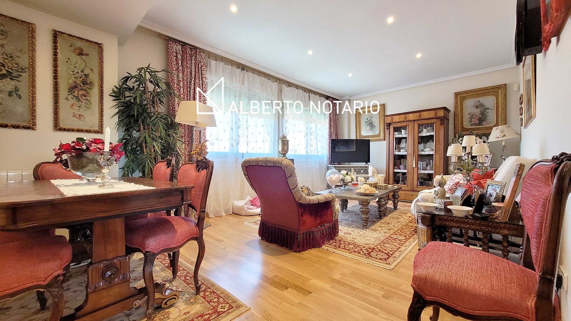 Salón-Comedor Señorial: Un espacio de grandes dimensiones con suelos de madera noble y ventanales panorámicos, ideal para crear diferentes ambientes de descanso y reunión.